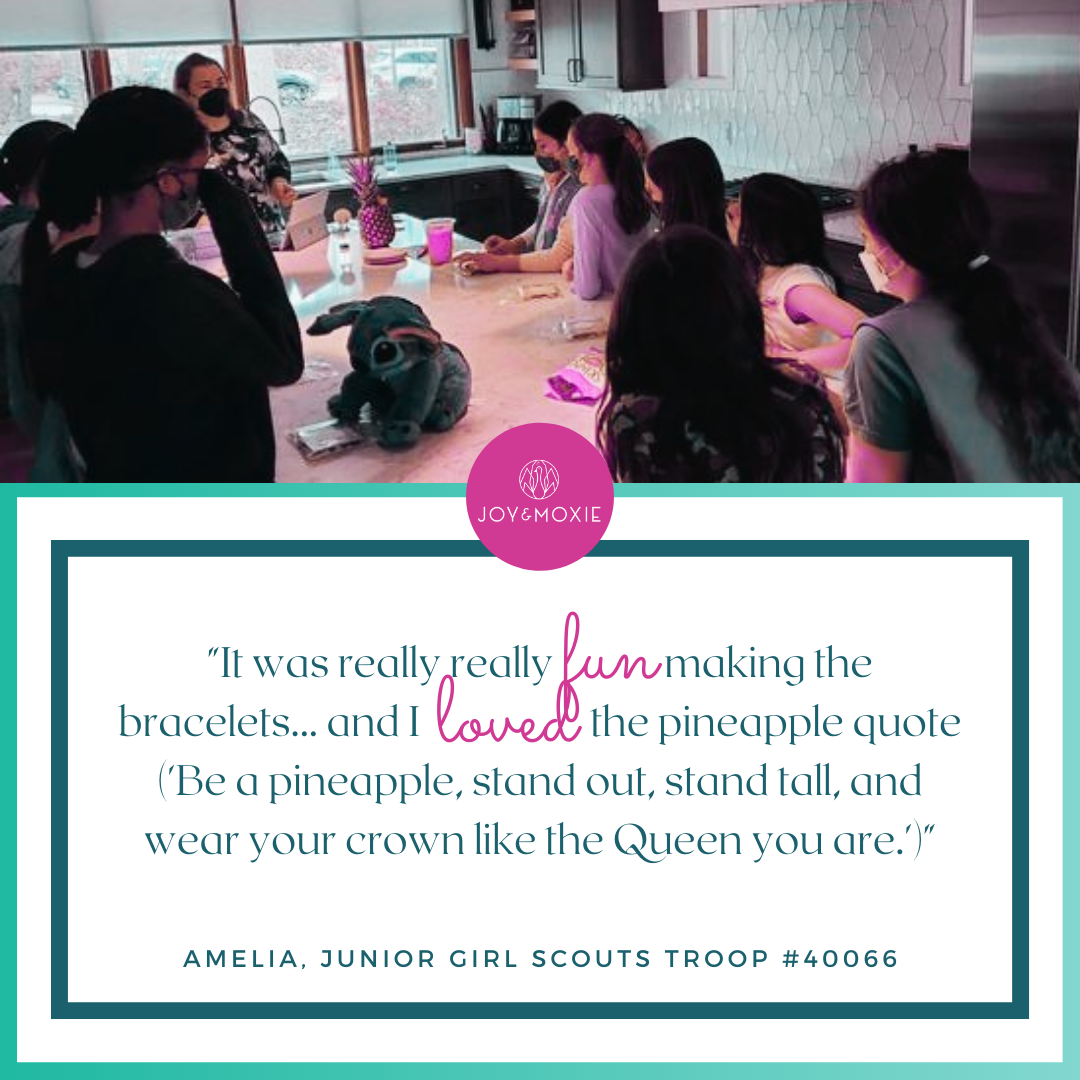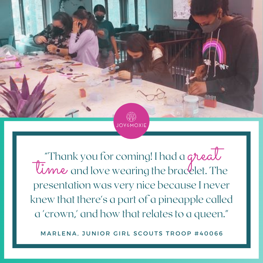 "It was really really fun making the bracelets... and I loved the pineapple quote ('Be a pineapple, stand out, stand tall, and wear your crown like the Queen you are.')" - Amelia, Junior Girl Scouts Troop #40066